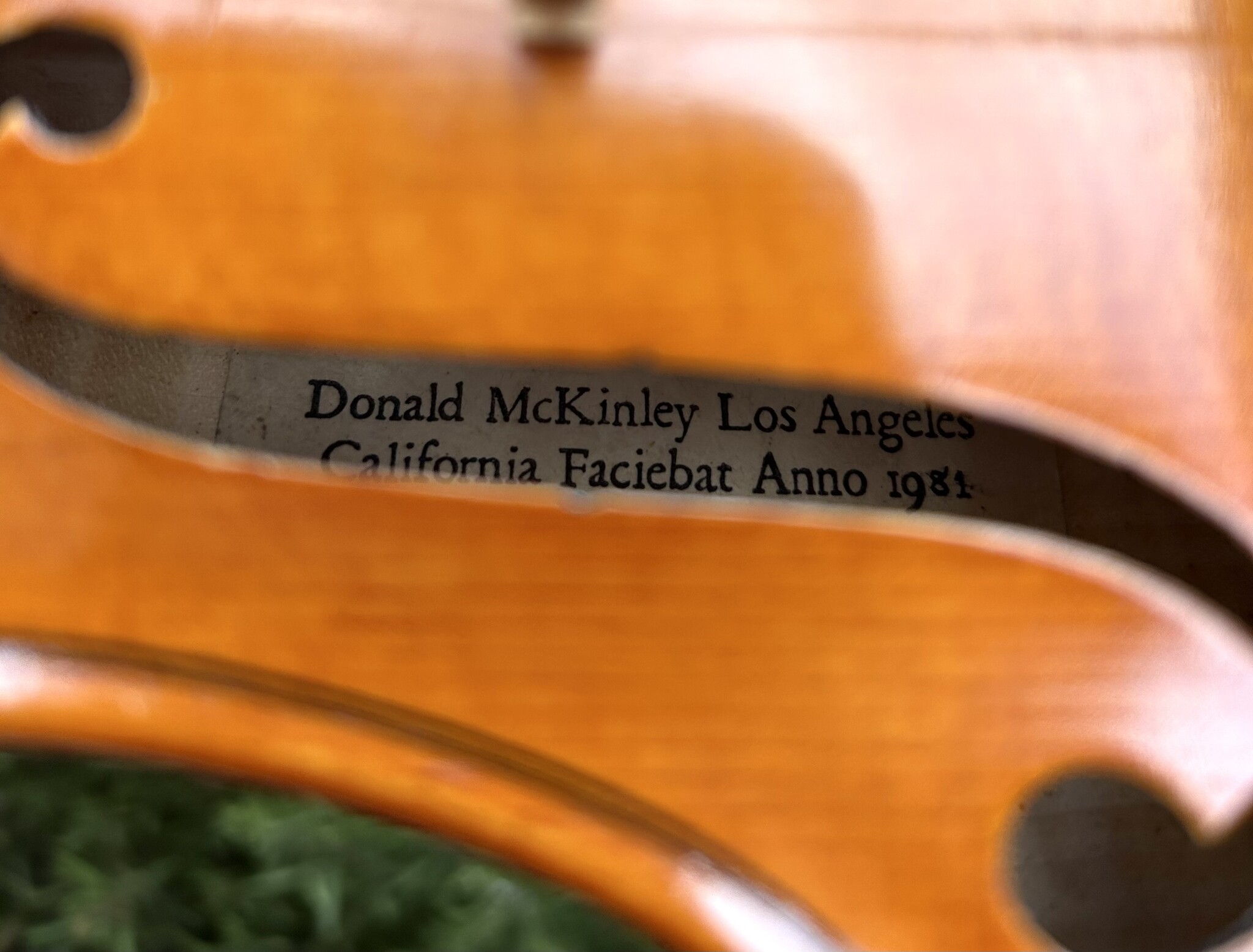 The back is formed from two pieces of quarter-cut maple, marked by medium-narrow-width flame that slants downward from the center joint. The wood of the ribs and scroll is similar to that of the back. The two-piece spruce top has straight, medium-narrow, even grain.