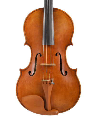 The viola bears the label "Douglas C. Cox, Brattleboro, Vermont, 2016, #912" and is branded and initialed inside. It is made of well aged North American grown wood. The back is cut on the quarter from two pieces of maple with handsome medium width flames descending very slightly from center joint. The neck and ribs are of maple of narrower flame than that of the back. The table is of two pieces of Engelmann spruce from British Columbia of very narrow growth.There is a filled sap pocket on the bass side of the tailpiece. The varnish is of an orange-brown color and is shaded and imitated. The fittings are of boxwood with lighter trim. The principal dimensions are: