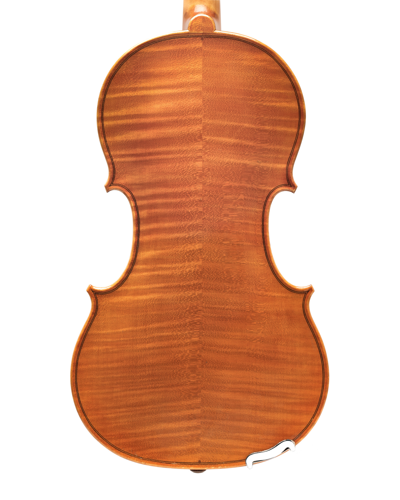 This violin is a lovely example of this tradition. The back is two pieces of quarter-cut maple with medium flame - the ribs and scroll match the back. The top is two pieces of spruce with narrow grain and beautiful subtle figuring. The figuring on both top and back is accentuated by the light golden varnish which has been tastefully shaded to reveal a pale-golden ground.