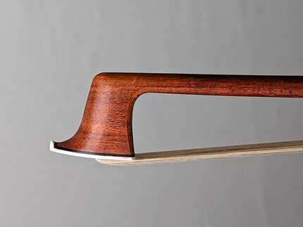 Description: Round stick, beautiful lightly flamed Pernambuco with prominent grain features, Peccatte inspired model. Mounted in silver and Ebony with 3 part adjuster and tinsel/silk thread winding.
