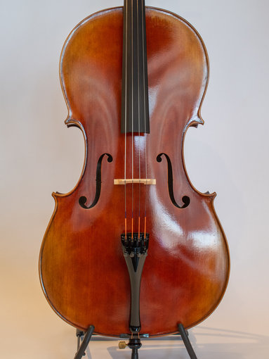 These cellos feature a striking flamed maple back, deep red-brown varnish with beautifully shaded gold spots, and a tone that is powerful, clear, and full. Starting in 2025, all "Xavier" cellos come with Wittner pegs installed.